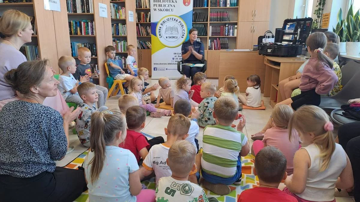 Mł. asp. Barbara Jastrzębska spotkała się z najmłodszymi czytelnikami, aby w przystępny sposób przybliżyć im zasady bezpiecznego zachowania w różnych sytuacjach dnia codziennego. Wydarzenie było częścią ogólnopolskiej kampanii „Kręci mnie bezpieczeństwo w lecie”, której celem jest promowanie odpowiednich postaw w trakcie wakacji.