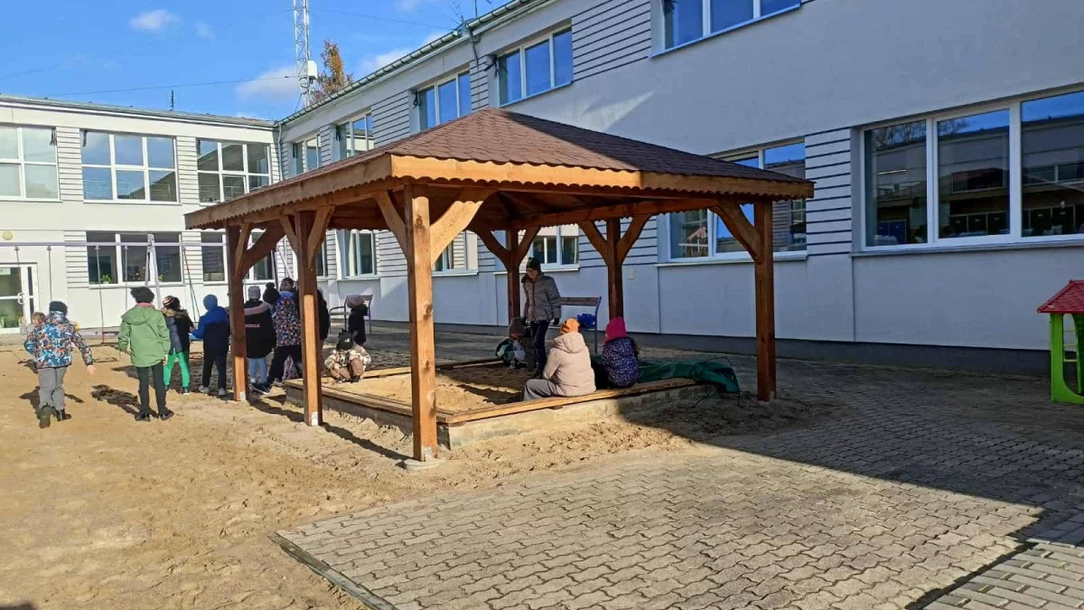 • żagiel przeciwsłoneczny czeka w gotowości. Choć altana już chroni przed deszczem, przestronny żagiel zostanie zamontowany z przodu szkoły i będzie służył w pełni lata, tworząc idealną, zacienioną strefę relaksu na dziedzińcu.