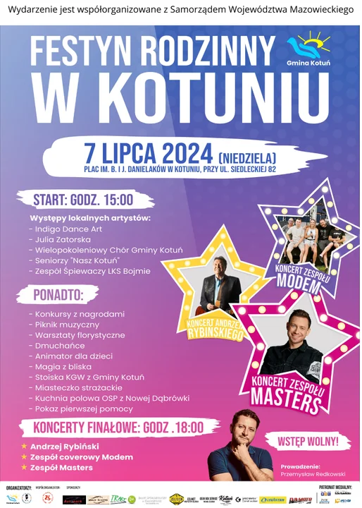 Start zabawy o 15:00. Na początek swoje talenty zaprezentują lokalni artyści m.in. Wielopokoleniowy Chór Gminy Kotuń. W programie również konkursy, warsztaty florystyczne i animacje dla dzieci. O 18:00 rozpoczną się koncerty finałowe. Gwiazdami wieczoru będą Andrzej Rybiński, Modem oraz Masters.
