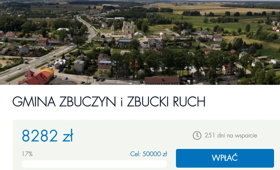 Cel to 50 tys. zł, obecnie uzbierano 16% tej kwoty (blisko 8 tys. zł). Mieszkańcy, a zwłaszcza Zbucki Ruch i wójt Hubert Pasiak, są bardzo zaangażowani w tę inicjatywę.