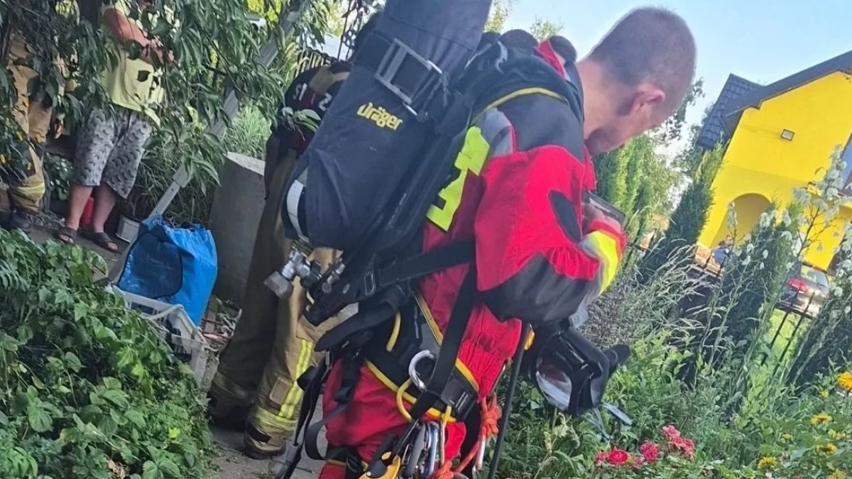 Strażacy przystąpili do działań ratowniczych, wykorzystując specjalistyczny sprzęt do pracy w trudno dostępnych miejscach. Na zdjęciu z miejsca zdarzenia widać ratownika w kombinezonie do działań wysokościowych, wyposażonego w aparat powietrzny, uprząż, karabinki asekuracyjne, liny oraz torby ze sprzętem technicznym.