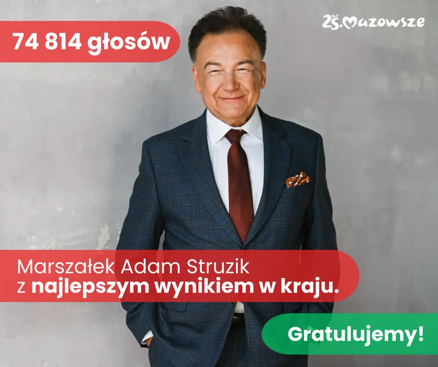 – To była krótka kampania, ale w samorządzie to nie ma znaczenia. Tu kampania trwa przez całą kadencję. Bardzo dziękuję wszystkim Mazowszanom, którzy oddali na mnie głos. To dla mnie olbrzymie zobowiązanie. Będziemy nadal rozwijać nasze piękne Mazowsze, tak abyśmy wszyscy byli z niego dumni – mówi marszałek Adam Struzik. – Wspólnie z koleżankami i kolegami z zarządu województwa otrzymaliśmy 200 tys. głosów. To dowód uznania i zaufania wyborców.