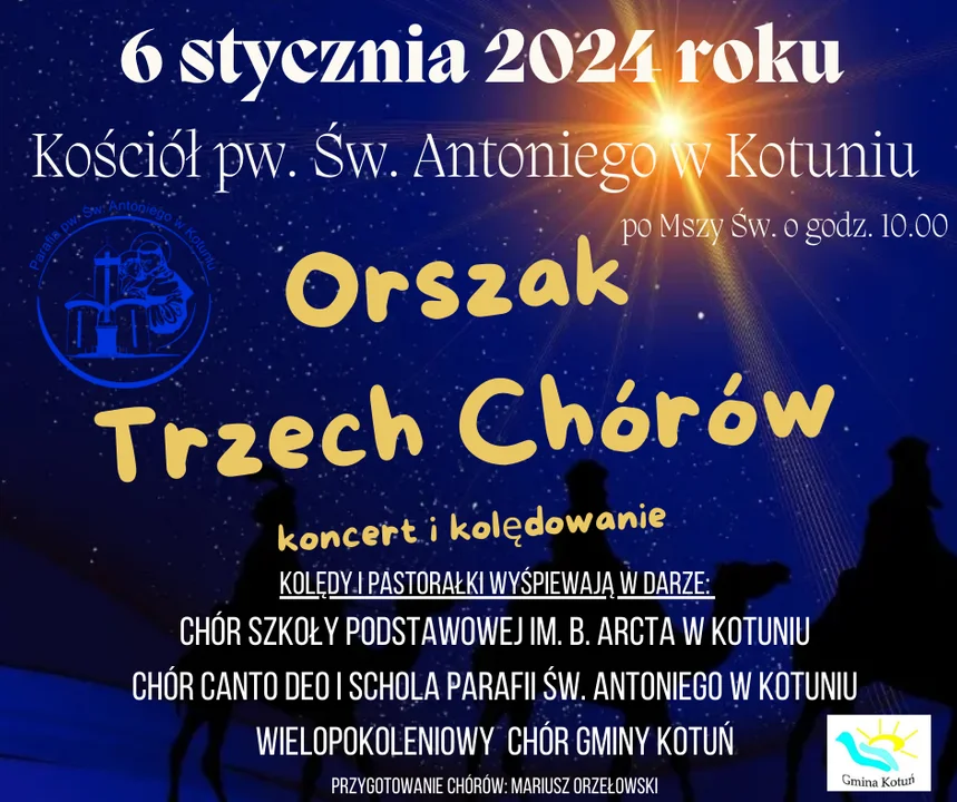 6 stycznia 2024 roku w kościele pw. św. Antoniego w Kotuniu około 10.45 rozpocznie się koncert, połączony z kolędowaniem w wykonaniu trzech chórów: Szkoły Podstawowej im. B. Arcta w Kotuniu, Chóru Canta Deo Parafii Św. Antoniego w Kotuniu oraz Wielopokoleniowego Chóru Gminy Kotuń.