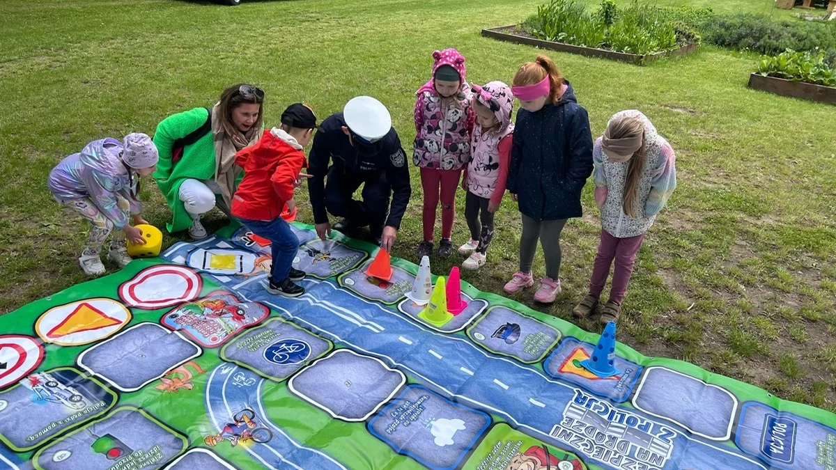 Dużym zainteresowaniem cieszył się również policyjny radiowóz oraz sprzęt wykorzystywany na co dzień przez funkcjonariuszy. Dzieci chętnie zadawały pytania, przymierzały elementy umundurowania i słuchały krótkich pogadanek profilaktycznych prowadzonych przez mundurowych. Policjanci rozdawali także odblaski i przypominali o zasadach bezpieczeństwa – zarówno w domu, jak i w szkole oraz na drodze.
