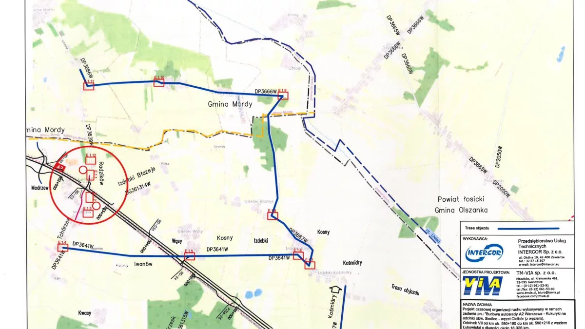 Starostwo Powiatowe w Siedlcach informuje, że w związku z prowadzoną budową autostrady A2 na odcinku VII, od km 580+190 do km 598+216, nastąpi zamknięcie drogi powiatowej nr 3639W w miejscowości Modrzew. Ruch zostanie skierowany na wyznaczony objazd przez miejscowości Modrzew, Izdebki-Kosny, Izdebki-Błażeje, Pióry-Pytki, Pióry Wielkie oraz Radzików Wielki.