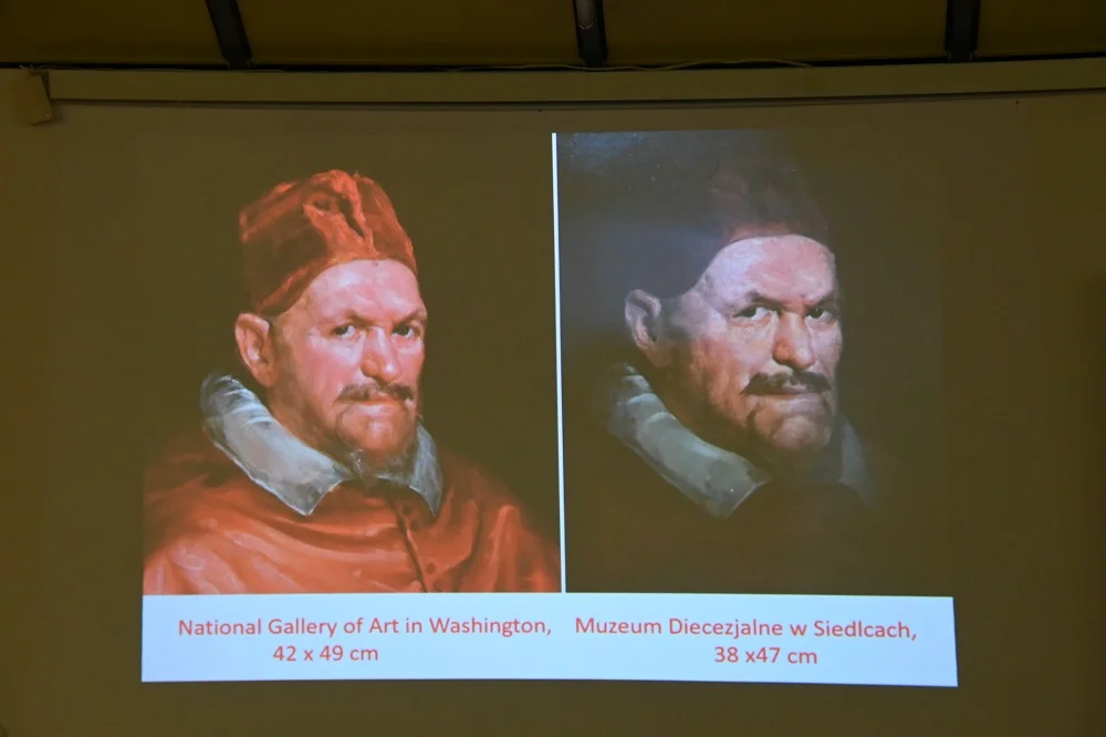 – Około 1650 Velazquez podczas podróży do Italii zrealizował zamówienie na portret papieża. Portret okazał się bardzo udany: niemłody już model został oddany z wielkim realizmem, a jego przeszywające spojrzenie wywarło wielkie wrażenie na odbiorcach. Powstały więc jeszcze trzy takie portrety: jeden znajduje się obecnie w Waszyngtonie, drugi u nas, a miejsce trzeciego jest nieznane. - opowiedział o obrazie ks. Robert Mirończuk, dyrektor Muzeum Diecezjalnego w Siedlcach.