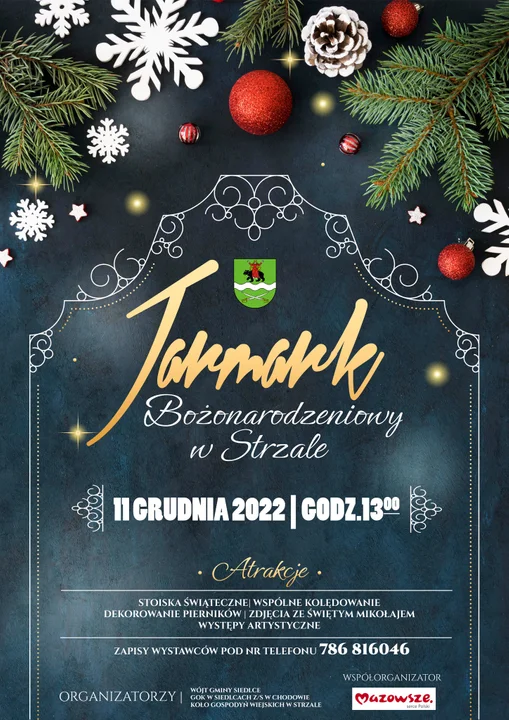 Wójt Gminy Siedlce, Gminny Ośrodek Kultury w Siedlcach, Koło Gospodyń Wiejskich w Strzale zapraszają na Jarmark Bożonarodzeniowy. Odbędzie się on w niedzielę, 11 grudnia w świetlicy w Strzale. Jarmark Bożonarodzeniowy rozpocznie się o godz. 13:00.
