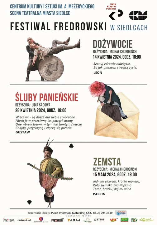 Będą to: "Dożywocie", "Śluby panieńskie" oraz "Zemsta" w wykonaniu aktorów Teatru Klasyki Polskiej. Festiwal, który odbędzie się w dniach 14, 28 kwietnia oraz 15 maja 2024 r. na deskach Sceny Teatralnej Miasta Siedlce, to trzydniowa uczta artystyczna dla miłośników teatru. Fredrowskie sztuki to pełnokrwiści bohaterowie, magnetyzm serc, spory sąsiedzkie i misterne knowania.