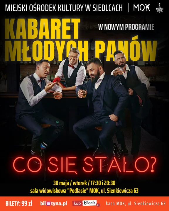 Najnowszy program Kabaretu Młodych Panów pt. „Co się stało?” jest sceniczną i oczywiście ironiczną odpowiedzią na pytanie, na które większość z nas odpowiada – nic. Czasami lekko rozwijamy odpowiedź, która automatycznie przechodzi w pytanie – nic, dlaczego pytasz?