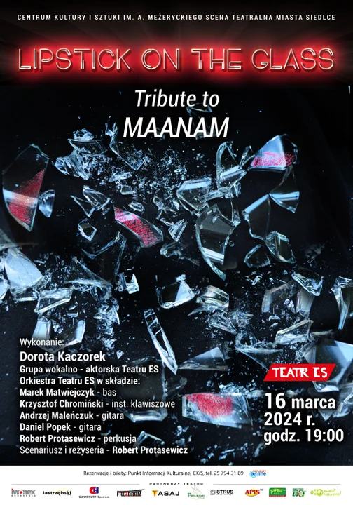 „Lipstick on the glass - Tribute to Maanam” to widowisko muzyczne prezentujące twórczość hitowego polskiego zespołu, którego liderka odeszła przedwczesną śmiercią po długiej chorobie. W koncercie usłyszeć będzie można znane wszystkim przeboje takie jak „Boskie Buenos”, „Cykady na Cykladach”, „Lipstick on the glass” i wiele, wiele innych, przy których bawiły się pokolenia. Kompozycje Marka Jackowskiego z tekstami Kory Jackowskiej w aranżacjach oddających klimat ubiegłego stulecia zaprezentuje Orkiestra Teatru ES w składzie: Marek Matwiejczyk, Krzysztof Chromiński, Andrzej Maleńczuk, Daniel Popek i Robert Protasewicz oraz Dorota Kaczorek, której elektryzujący wokal przeniesie nas w czasy kiedy Maanam święcił tryumfy na scenach i estradach w całym kraju. Solistce towarzyszyć będzie grupa wokalno-aktorska Teatru ES w specjalnie zaaranżowanych scenkach teatralnych. Całość koncertu dopełniają: ciekawa scenografia, dynamiczne wizualizacje i materiały filmowe ukazujące prywatną stronę życia Kory.