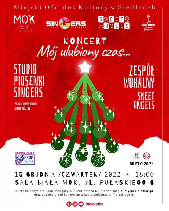 Bilety w cenie 20 zł do nabycia online na bilety.mok.siedlce.pl i w kasie MOK, ul. Sienkiewicza 63, od poniedziałku do piątku w godz. 8:00-15:45 oraz godzinę przed koncertem w Sali Białej. Rezerwacje miejsc pod nr tel. 25 794 31 26. Liczba miejsc ograniczona.