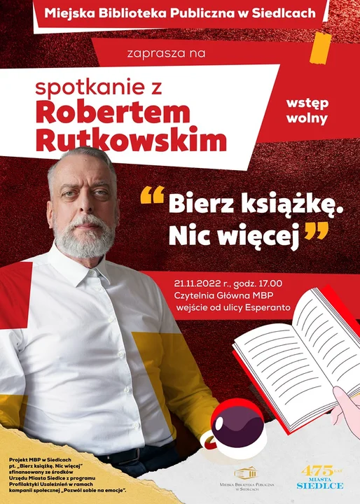 Spotkanie organizowane jest w ramach projektu MBP w Siedlcach pn. „Bierz książkę. Nic więcej” sfinansowanego ze środków Urzędu Miasta Siedlce z programu Profilaktyki Uzależnień w ramach kampanii społecznej „Pozwól sobie na eMOCje”.