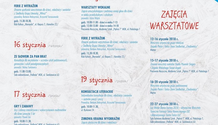 - 19 stycznia 2018 r. (środa), godz. 12:00, Sala widowiskowa „Podlasie” MOK, ul. Sienkiewicza 6, Zimowa Kraina Wyobraźni – zajęcia plastyczne dla dzieci i młodzieży prowadzone przez Annę Wiśniewską.