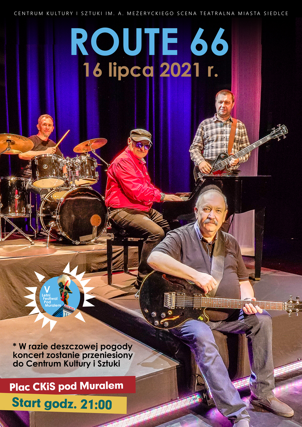 Zespół Route 66 powstał w 2010 r. Wielokrotnie występował m.in. na siedleckich Gitariadach, brał udział w Fali Bluesa, koncertował przy Fontannie. Ponadto prezentował się na scenie muzycznej w Łukowie, Łosicach i innych miejscowościach w regionie. Route 66 ma w swoim bogatym repertuarze muzykę rockową, głównie z lat 1970-1980 oraz bluesową. Podczas koncertu usłyszymy utwory z repertuaru Tadeusza Nalepy czy Rolling Stonesów m.in. "Modlitwę" i "Dbaj o miłość", "Satisfaction", "Bluesman" BB Kinga, "Sharp dressed man" ZZ TOP oraz kilka kompozycji Marka Somli: "Pająk kosmaty blues", "Rudowłosa", "Wędkarskie opowieści".