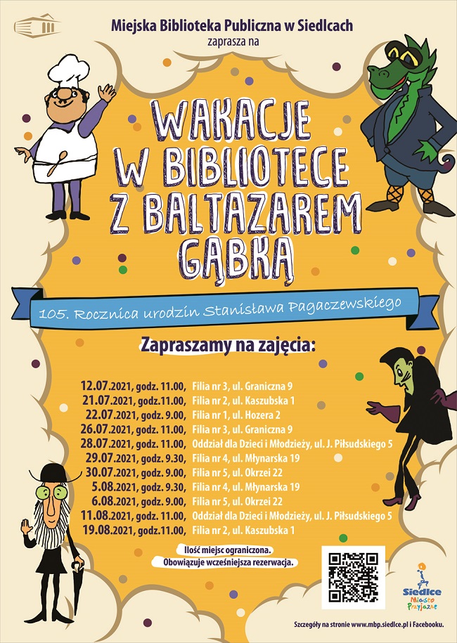 Miejska Biblioteka Publiczna w Siedlcachzaprasza dzieci na cykl zajęć edukacyjno- czytelniczych pt. „Wakacje w bibliotece z Baltazarem Gąbką” organizowanych z okazji 105. rocznicy urodzin Stanisława Pagaczewskiego - prozaika, poety, reportażysty, autora książek dla dzieci oraz przewodników krajoznawczych. Twórcy serii poświęconej przygodom Baltazara Gąbki, należącej do klasyki literatury dziecięcej.
