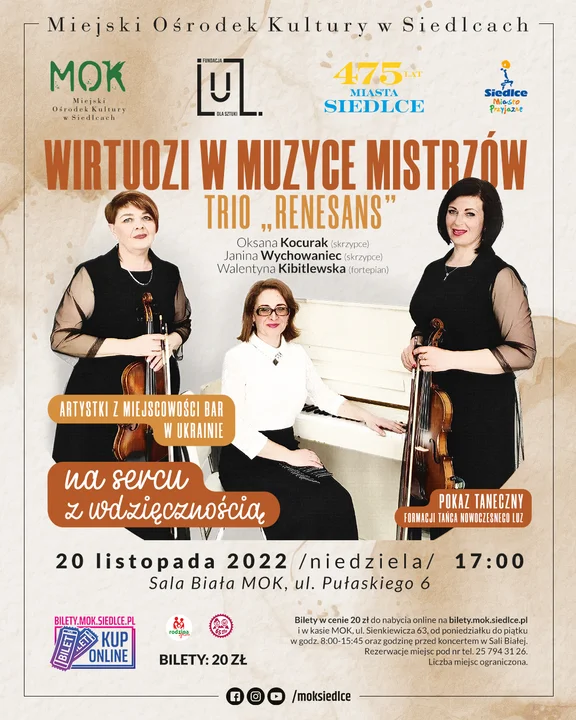 Bilety w cenie 20 zł do nabycia online na bilety.mok.siedlce.pl i w kasie MOK, ul. Sienkiewicza 63, od poniedziałku do piątku w godz. 8:00-15:45 oraz godzinę przed koncertem w Sali Białej. Rezerwacje miejsc pod nr tel. 25 794 31 26. Liczba miejsc ograniczona.