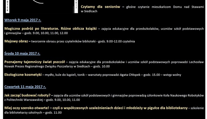 Kultura<b>W dniach od 8 do 16 maja, w Bibliotece Pedagogicznej w Siedlcach, odbędzie się szereg zajęć i spotkań z okazji XIV Ogólnopolskiego Tygodnia Bibliotek. </b><br style="">