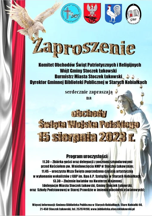 O 11:45 odbędzie się uroczysta msza święta w kościele pw. Wniebowzięcia NMP w Stoczku Łukowskim. Przed eucharystią zaprezentowana zostanie część artystyczna przygotowana przez wokalistów z Gminnej Biblioteki Publicznej w Starych Kobiałkach.