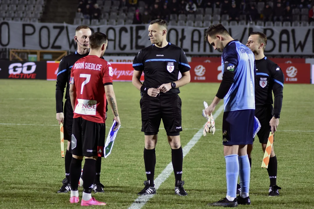 W 20 minucie Szuprytowski wywalczył rzut wolny i zabrał się za jego wykonanie. Pomocnik Pogoni oddał kapitalny strzał, który musnął po głowie rywala i trafił do siatki. Radość siedlczan z prowadzenia nie trwała długo. Po stracie Jakuba Siniora Mateusz Wysokiński podał do Putny, który znalazł sposób na pokonanie Burka. Podrażniona Pogoń przycisnęła w kolejnych minutach. W 33 minucie powinno być 2:1 dla biało-niebieskich. Strzał Mike'a Karwota z rzutu wolnego zatrzymał się na słupku, a dobitka Walczaka w rękach Macieja Krakowiaka. Niewykorzystana sytuacja zemściła się błyskawicznie. Sobol popisał się celną główką po wrzutce Mateusza Żebrowskiego. Snajper KKS nie zadowolił się jednym golem. Po zgraniu Putny i przedłużeniu Dzięcioła z prezentu skorzystał Sobol.