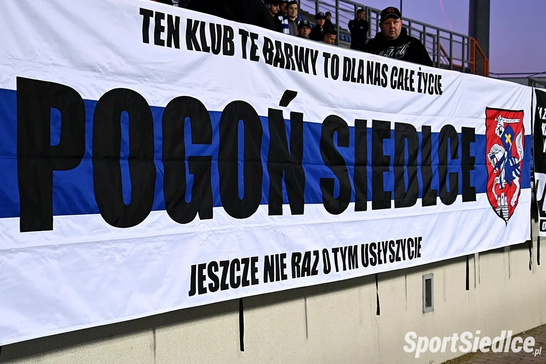 Początek spotkania nie wskazywał na wysoką porażkę siedlczan. Pogoniści kontrolowali spotkanie, choć nie dochodzili do przesadnie wielu klarownych sytuacji strzeleckich. Najlepszą okazję w pierwszych dwóch kwadransach miał Piotr Pyrdoł, który po podaniu Krystiana Misia trafił w Kacpra Tułowieckiego. W 27 minucie straty w strefie środkowej dopuścił się Jakub Sinior. Wojciech Słomka zagrał wzdłuż pola karnego do Wojciecha Łuczaka, a ten trafił z pomocą rykoszetu od Ernesta Dzięcioła. Do przerwy byłoby 1:1 gdyby w końcówce pierwszej połowy Przemysław Misiak nie ostemplował spojenia po dośrodkowaniu z rzutu rożnego.