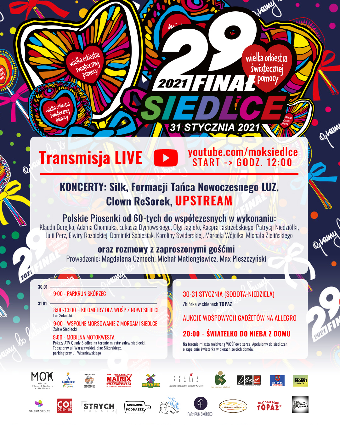 O godz. 20:00 – Światełko do Nieba z domu... Apelujemy do wszystkich siedlczan, aby o godz. 20:00 zapalić światełko w oknie swojego domu i w ten sposób dołączyć do naszej akcji. Dodatkowo, na terenie miasta rozbłysną jeszcze WOŚPowe serduszka.