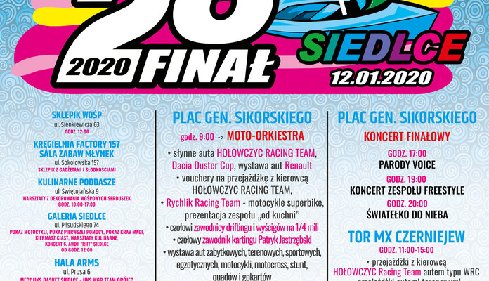 Będziecie mogli zobaczyć słynne auta Hołowczyc Racing Team, Dacia Duster Cup, wystawę aut Renault i wylicytować vouchery na przejażdżkę z zawodnikiem Hołowczyc Racing Team. Na wystawę motocykli superbike i prezentację zespołu „od kuchni” zaprasza Rychlik Racing Team. Na Placu pojawią się również czołowi zawodnicy polskiego driftingu (Mateusz „Mały” Pawlak, Marcin „Małpa” Skwierczyński), wyścigów na 1/4mili (Firmy ProTurbo oraz Szefo Performance) ze swoimi autami, a także czołowy zawodnik kartingu Patryk Jastrzębski wraz ze swoimi gokartami. Dzięki stowarzyszeniom MTZ Korba, NATURA-lnie 4x4, Moto Siedlce, ATV Quady Siedlce i Motocross Enduro SRC będziecie mogli zobaczyć wystawę aut zabytkowych, terenowych, sportowych i egzotycznych, motocykli, motocross, stunt, quadów i gokartów. Odbędą się także pokazy driftingu, procedury startowej wyścigów na ¼ mili, stuntu motocyklowego i rowerowego, kartingu, a dla chętnych, którzy wspomogą WOŚP możliwość przejażdżki z zawodnikami i wystawcami oraz wyjątkowe zabiegi – od kosmetyki po chip tuning. Przeprowadzimy także szkolny konkurs malowania samochodów.