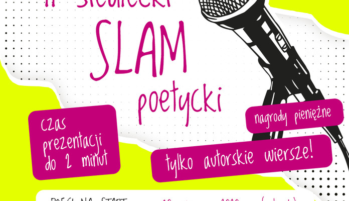 Miejski Ośrodek Kultury w Siedlcach i Siedlecka Grupa Literacka „Witraż” MOK pragną poinformować, że „II Siedlecki Slam Poetycki – on line” nie został rozstrzygnięty. Organizatorzy postanowili – wzorem roku ubiegłego – zaprosić poetki i poetów do udziału w „Slamie” na żywo – na Skwer przy Fontannie, ul. Pułaskiego 6.
