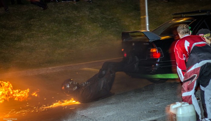 * przejazd przez ścianę ognia z człowiekiem na masce pojazdu;