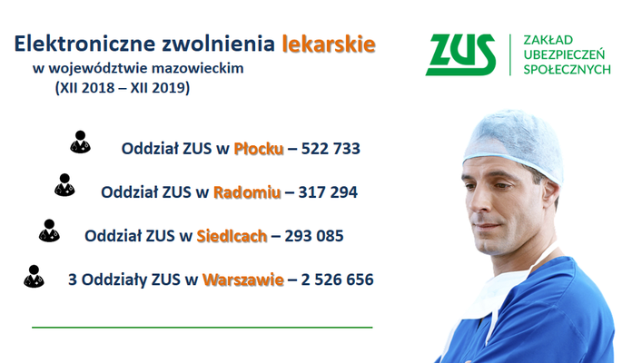 Jak informuje Piotr Olewiński, regionalny rzecznik prasowy Zakładu Ubezpieczeń Społecznych, od 1 grudnia 2018 r. do 1 grudnia 2019 r. lekarze na Mazowszu wystawili prawie 3,7 mln elektronicznych formularzy. Najwięcej zwolnień było na terenie 3 warszawskich oddziałów ZUS, natomiast najmniej we wschodniej części regionu. W ostatnim miesiącu zaświadczenia wystawiało w Polsce aż 101,3 tys. lekarzy.