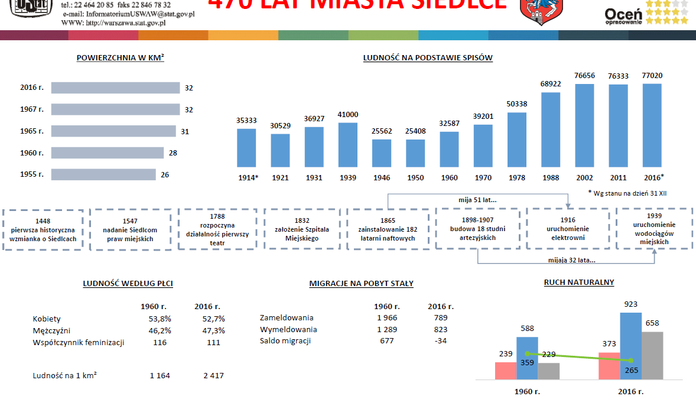 Grafika, w której zawarte są dane dotyczące naszego miasta dostępna jest na stronie: http://warszawa.stat.gov.pl/opracowania-biezace/informacje-okolicznosciowe/inne-/470-lat-miasta-siedlce,56,1.html.