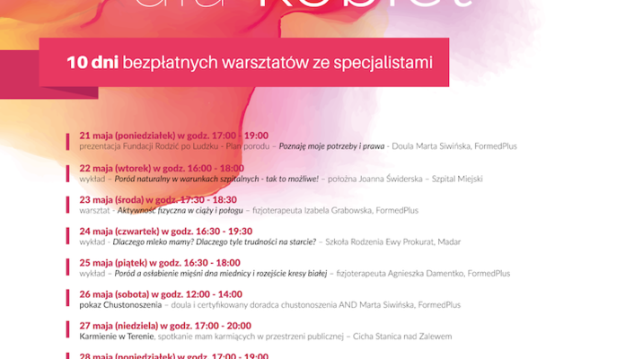 - 23 maj (środa) w godz. 17:30 - 18:30 – warsztat - Aktywność fizyczna w ciąży i połogu – fizjoterapeuta Izabela Grabowska, FormedPlus ul. Sokołowska 51