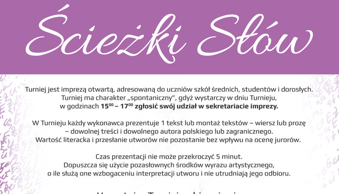 Miejski Ośrodek Kultury w Siedlcach zaprasza do udziału w XVIII Spontanicznym Turnieju Sztuki Recytatorskiej „Ścieżki Słów”.