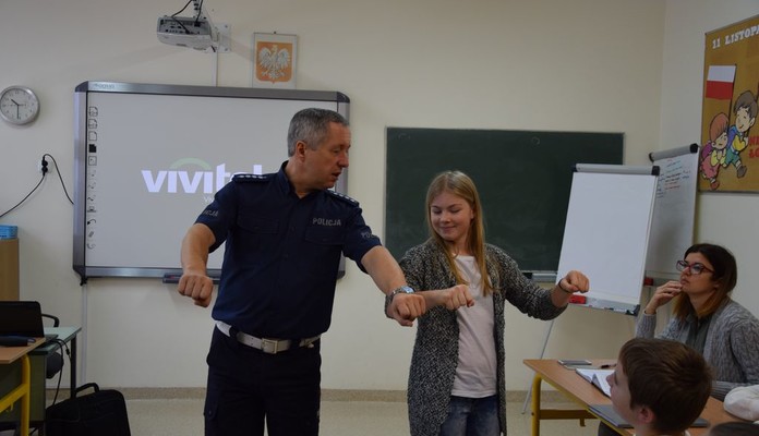 Z uczniami Szkoły Podstawowej rozmawiał natomiast na temat bezpiecznego poruszania się po drogach jako pieszy czy rowerzysta. Mając na uwadze, iż wielu uczniów dojeżdża do szkoły rowerami, "na sucho" zostały przećwiczone najbardziej popularne manewry i sposób ich sygnalizowania przez rowerzystów, co wywołało sporo śmiechu, ale też pozwoliło utrwalić nawyk sygnalizacji każdego manewru.