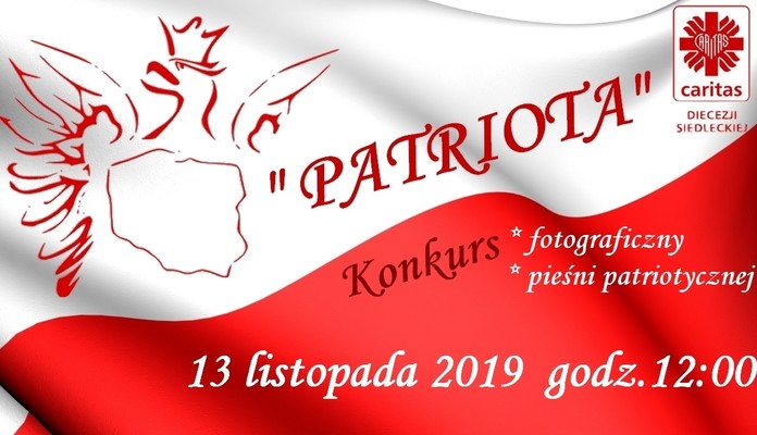 Pierwszy z nich to Konkurs Pieśni Patriotycznej „PATRIOTA 2019”, adresowany do szkół i przedszkoli z terenu diecezji. Składa się on z etapów szkolnego i diecezjalnego. Pierwszy zostaje przeprowadzony we własnym zakresie na terenie szkoły, po czym szkoła typuje jedną drużynę jako swoich reprezentantów do etapu diecezjalnego. Zgłoszenia przyjmowane są w następujących kategoriach wiekowych: przedszkole i klasy I-III szkoły podstawowej, szkoła podstawowa klasy IV-VIII oraz szkoła średnia. Aby wziąć udział w konkursie, placówka do godziny 16.00 6 listopada zgłasza (na e-mail: skc.siedlce@caritas.pl lub adres: Caritas Diecezji Siedleckiej, ul. Budowlana 1, 08-110 Siedlce z dopiskiem: PATRIOTA - decyduje data dostarczenia zgłoszenia) pełną listę uczestników. W etapie diecezjalnym każda szkoła będzie mogła zaprezentować tylko 1 pieśń lub piosenkę patriotyczną, z zastrzeżeniem, że wykonywany utwór, jaki zgłaszają szkoły, nie może się powtarzać (o wykonywanym utworze decyduje kolejność zgłoszeń). Etap diecezjalny i finał konkursu odbędzie się 13 listopada w Centrum Kultury i Sztuki w Siedlcach.