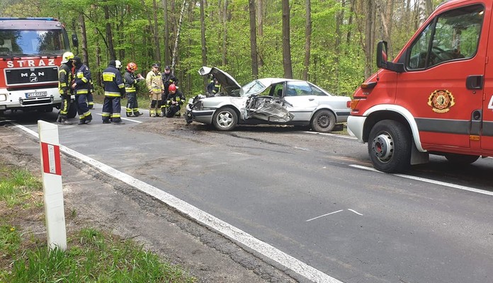 Jak wstępnie ustalili mundurowi, 53 - letni kierowca audi wyprzedzając kolumnę samochodów, zderzył się jadącym z naprzeciwka osobowym audi prowadzonym przez 24 - latka z powiatu łukowskiego. Audi, którym kierował 53-latek również z powiatu łukowskiego, wjechało do rowu i uderzyło w drzewo. Kierowca doznał urazu ręki i został przewieziony do szpitala. Obaj kierowcy byli trzeźwi.