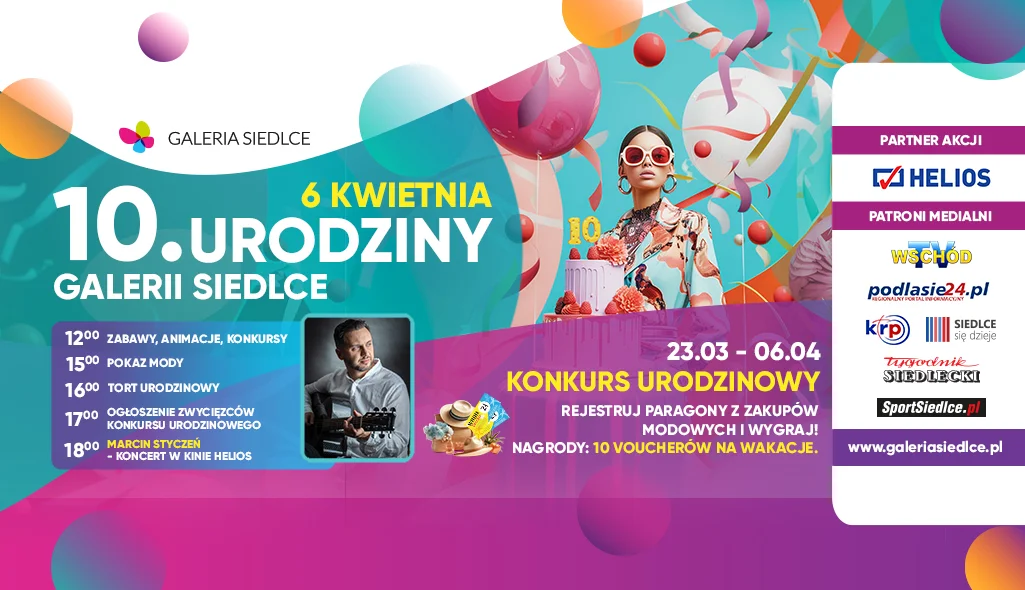 Gwiazdą urodzinowego wieczoru będzie Marcin Styczeń wraz z zespołem. Koncert odbędzie się o godz. 18:00 w Sali kinowej kina Helios. Wstęp wolny. Marcin Styczeń to artysta obdarzony przejmującym, ciepłym głosem. Jego dorobek to jedenaście płyt, pięć z nich stworzył wspólnie z poetą, Ernestem Bryllem. Od ponad 20 lat śpiewa, komponuje, pisze teksty. Koncertuje w kraju i zagranicą. Z okazji urodzin przewidziano dla klientów konkurs urodzinowy, który rozpoczął się jeszcze przed Świętami i trwa aż do dnia finału, czyli 6 kwietnia. Nagrodami w konkursie jest 10 voucherów na wakacje o wartości od 500 zł do 3000zł. Konkurs polega na rejestrowaniu paragonów z zakupów odzieży, obuwia i dodatków w punkcie konkursowym, a osoby, które zarejestrują paragony na najwyższe kwoty zdobędą nagrody. Rozstrzygnięcie konkursu nastąpi 6 kwietnia o 17:00.