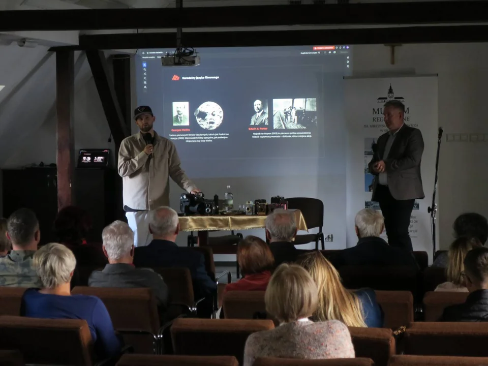 Paweł Przewoźny przedstawił rozwój kinematografii od jej początków. Omówił działalność braci Lumière i wynalazek kinematografu z 1895 roku. Wspomniał o pierwszych reakcjach widzów na seanse filmowe, w tym o sytuacjach, gdy publiczność opuszczała salę, widząc na ekranie zbliżający się pociąg. Prelegent przypomniał także postać Kazimierza Pruszyńskiego, konstruktora pleografu z 1894 roku oraz aeroskopu z 1908 roku – pierwszej ręcznej kamery filmowej o napędzie automatycznym. Urządzenie to wykorzystywano do rejestrowania materiałów wojennych w czasie I wojny światowej.