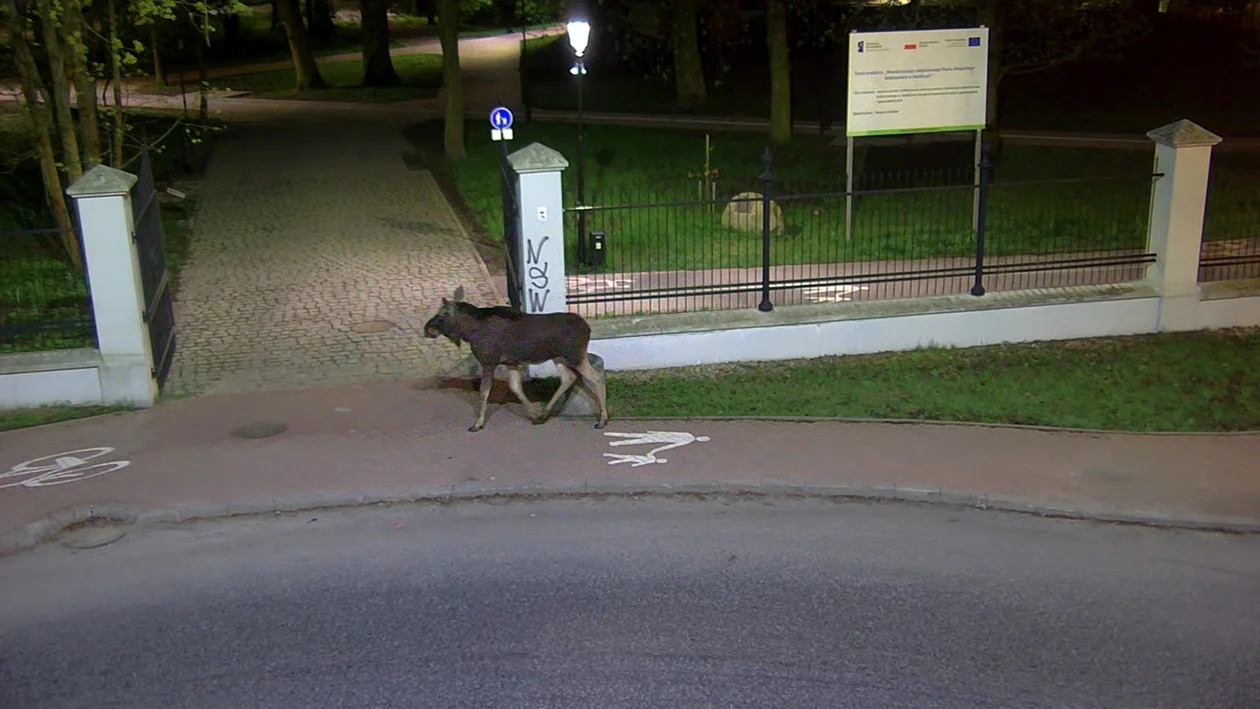 Wizytę łosia nagrały kamery miejskiego monitoringu.