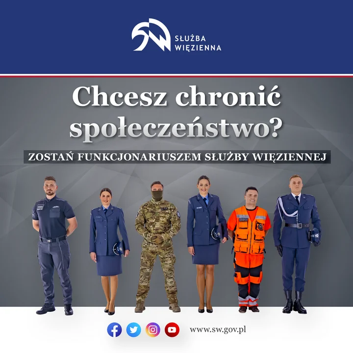 Myślisz o stabilnej i stałej pracy? Cenisz możliwość rozwoju osobistego? Chcesz służyć Rzeczypospolitej? Interesujesz się resocjalizacją, kryminologią, ochroną społeczeństwa przed sprawcami przestępstw? Chcesz realizować zadania z obszaru służby zdrowia? Lubisz stawiać czoła nowym wyzwaniom? A może dopiero wchodzisz na rynek pracy i poszukujesz ciekawej oferty zatrudnienia? Zapraszamy do pracy w charakterze funkcjonariusza Służby Więziennej!