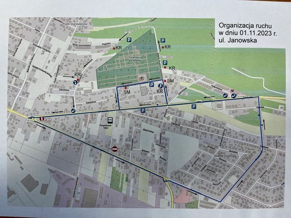 - ul. św. Królowej Jadwigi nie będzie można dojechać na tyły cmentarza. W tym miejscu będzie obowiązywał nakaz jazdy w prawo do ul Żaboklickiej a następnie ul. Janowską w kierunku skrzyżowania z ul. Starowiejską.
