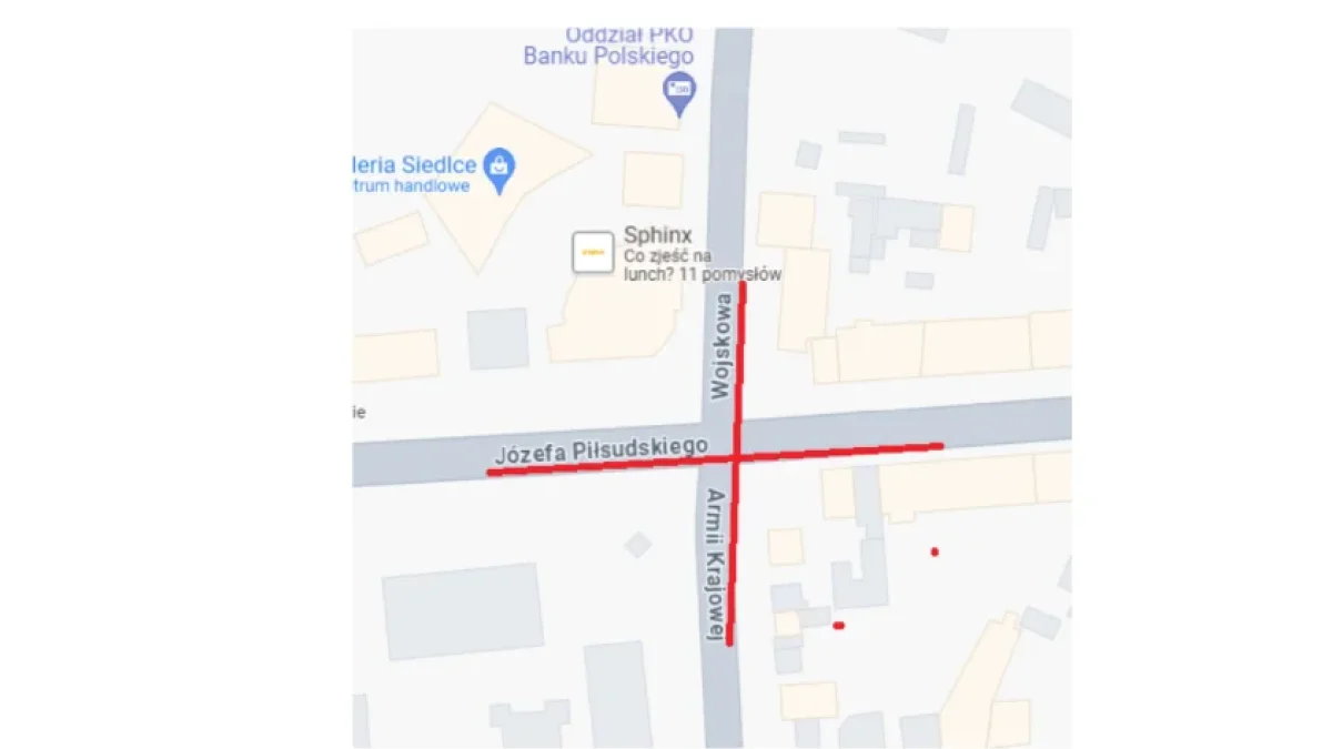 Wyjazd i wjazd do Galerii Siedlce i przychodni Kriosonik od strony Wojskowej będą możliwe w kierunku ulic Katedralnej i Sportowej.