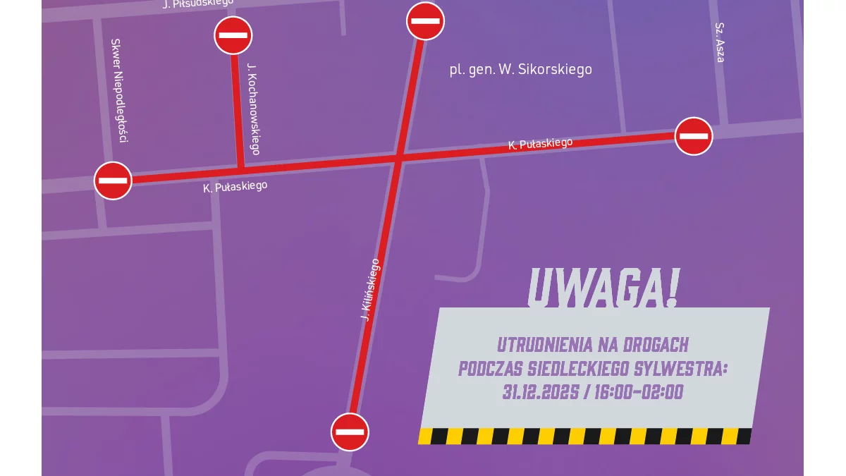 W związku z organizacją Siedleckiego Sylwestra w Siedlcach, mieszkańcy i kierowcy muszą liczyć się z czasowymi utrudnieniami w ruchu drogowym, które wystąpią w centrum miasta w nocy z 31 grudnia 2025 r. na 1 stycznia 2026 r.