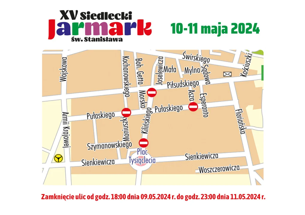 Miejski Ośrodek Kultury w Siedlcach informuje, że w związku z organizacją XV Siedleckiego Jarmarku św. Stanisława zostaną zamknięte dwa pasy ul. Kilińskiego na odcinku od ul. Piłsudskiego do ronda wokół kościoła Garnizonowego oraz ul. Pułaskiego na odcinku od ul. Kochanowskiego do ul. Asza od godziny 18:00 9 maja do godziny 23:00 11 maja.
