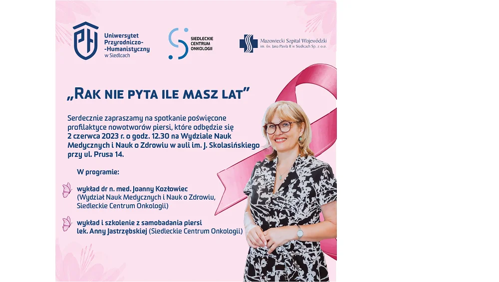 Z Siedlec2 czerwca o 12.30 na Wydziale Nauk Medycznych i Nauk o Zdrowiu w auli im. J. Skolasińskiego przy ul. Prusa 14 odbędzie się spotkanie poświęcone profilaktyce nowotworów piersi „Rak nie pyta ile masz lat”.
